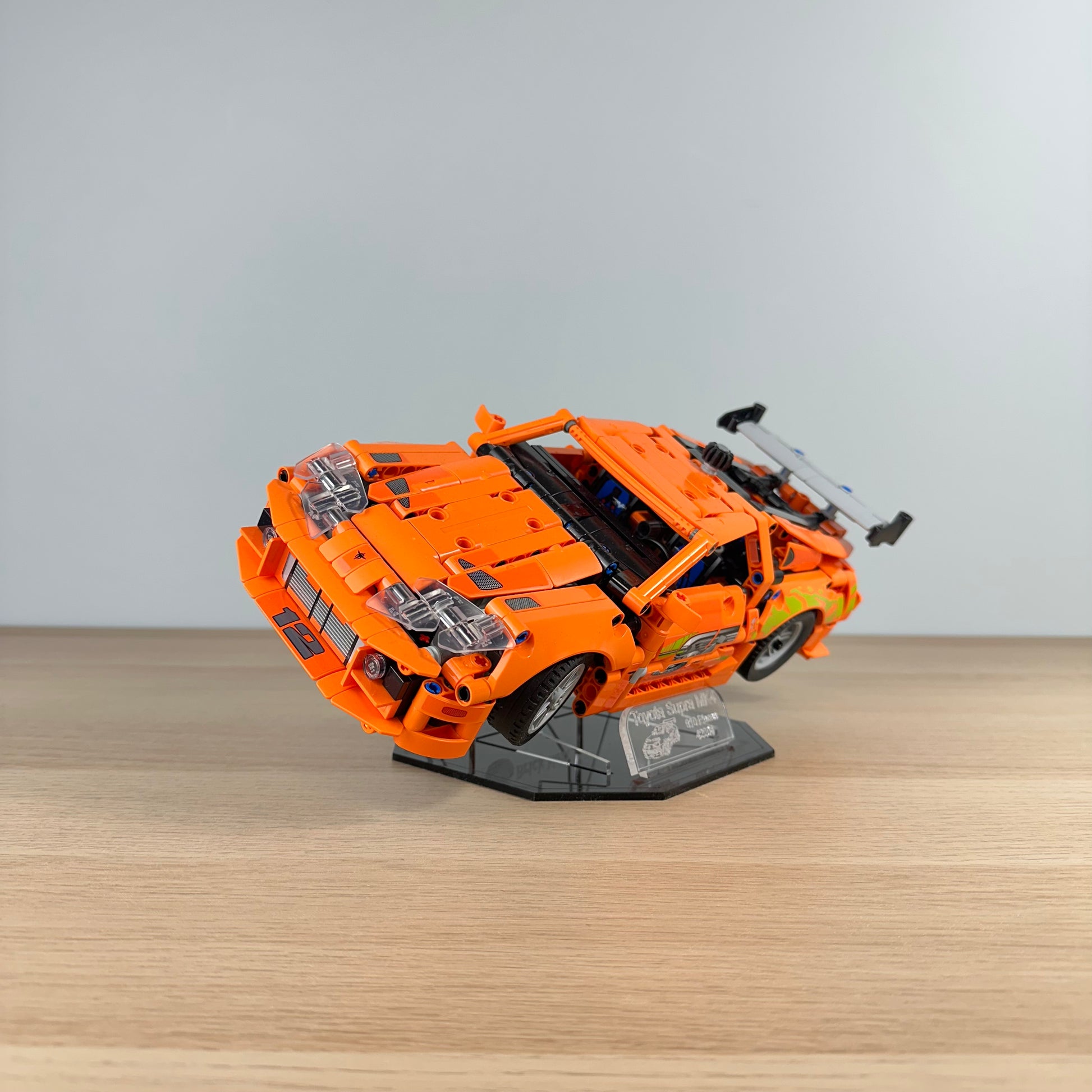 Set at a perfect viewing angle, the display lifts the model with crystal-clear supports, letting the Supra appear as if it’s mid-scene from the streets of L.A. or the starting line of a quarter-mile race. The black base contrasts perfectly with the orange paint and graphic decals of the Lego model, ensuring your car stands out wherever it's displayed.